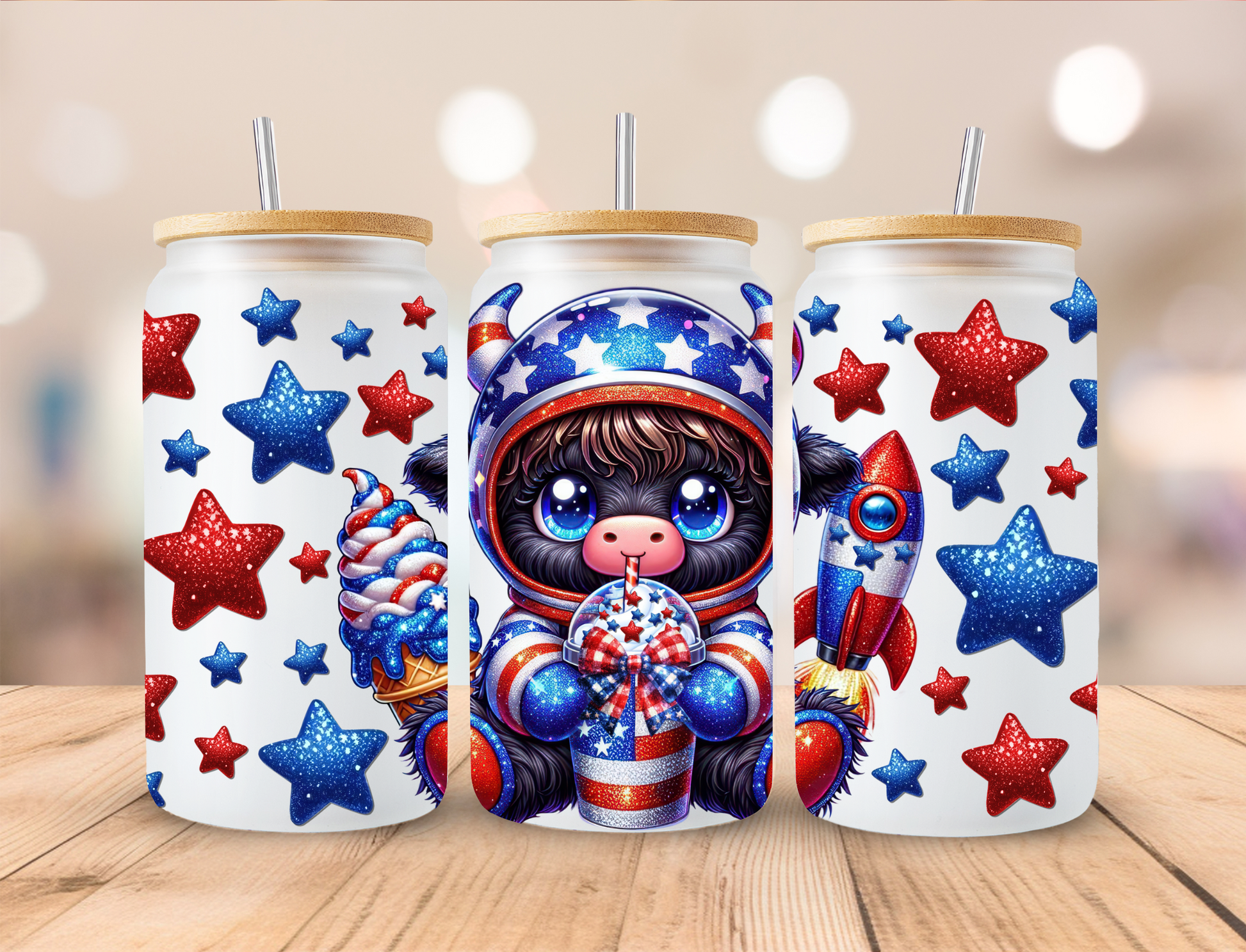 Astronaut Highland Cow July 4th Libbey Glass Transfer